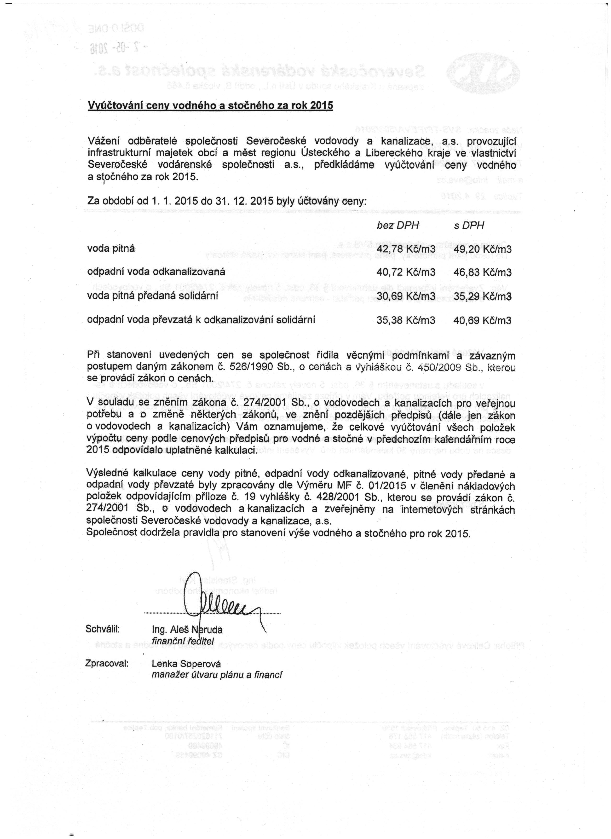 Zveřejnění informací - SVS výpočet ceny vodného a stočného za rok 2015