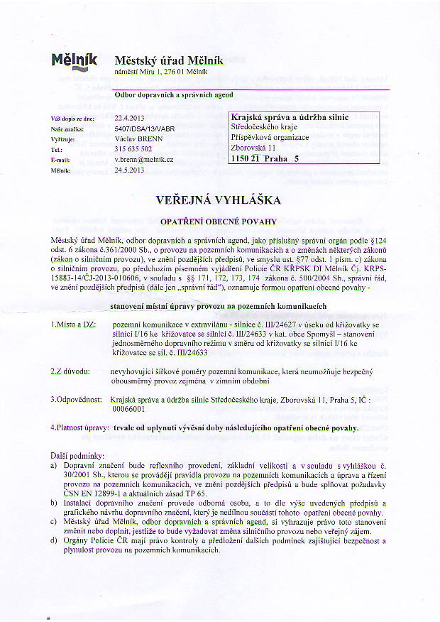 MÚ Mělník Veřejná vyhláška opatření obecné povahy
