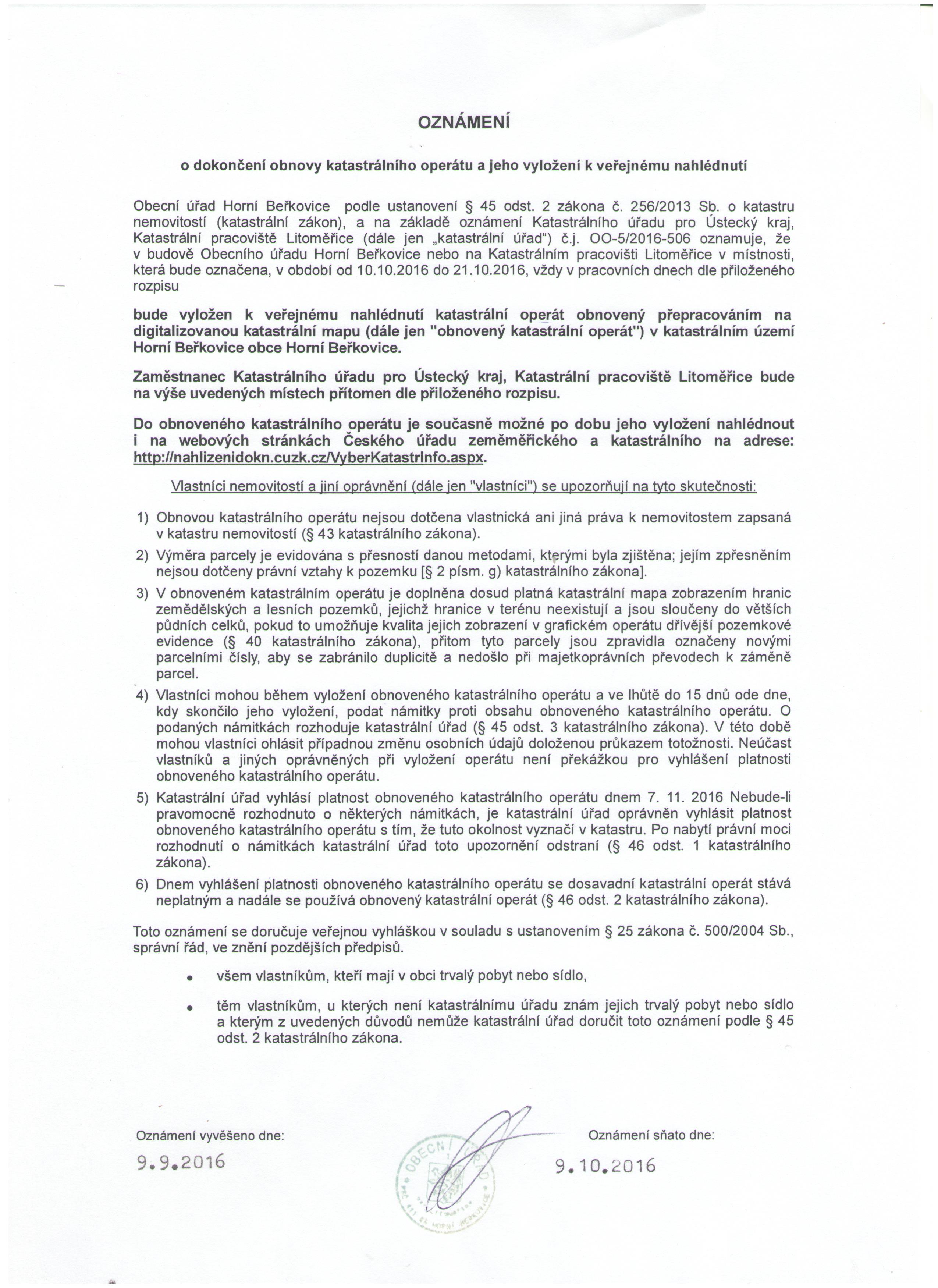 Oznámení o dokončení obnovy kat. operátu a jeho vyložení k veřejnému nahlédnutí